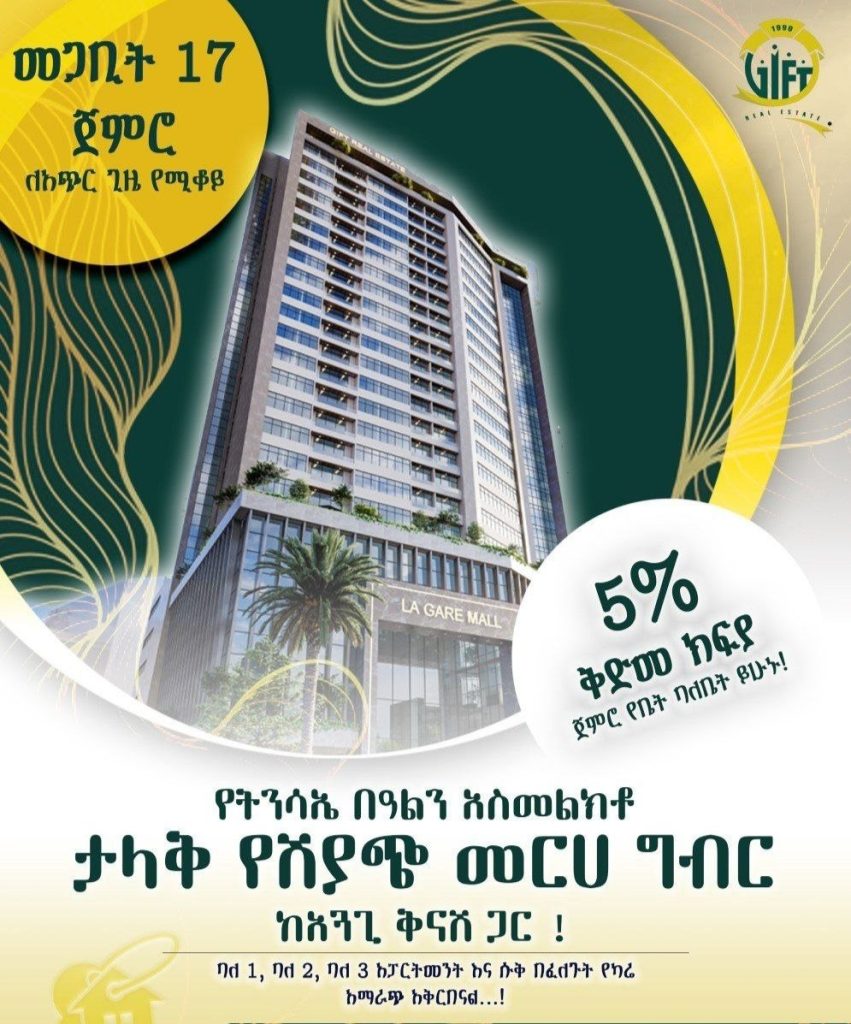 Gift Real Estate’s La Gare (Legehar) site is a luxury mixed-use development in the heart of Addis Ababa, located near the old railway station. The project features a G+21 building offering residential apartments and commercial spaces with modern amenities like smart home technology and electric car charging stations. The development is designed for high-end urban living with extensive facilities. Residential units range from one to three bedrooms, while commercial spaces include shops on the ground and first floors.